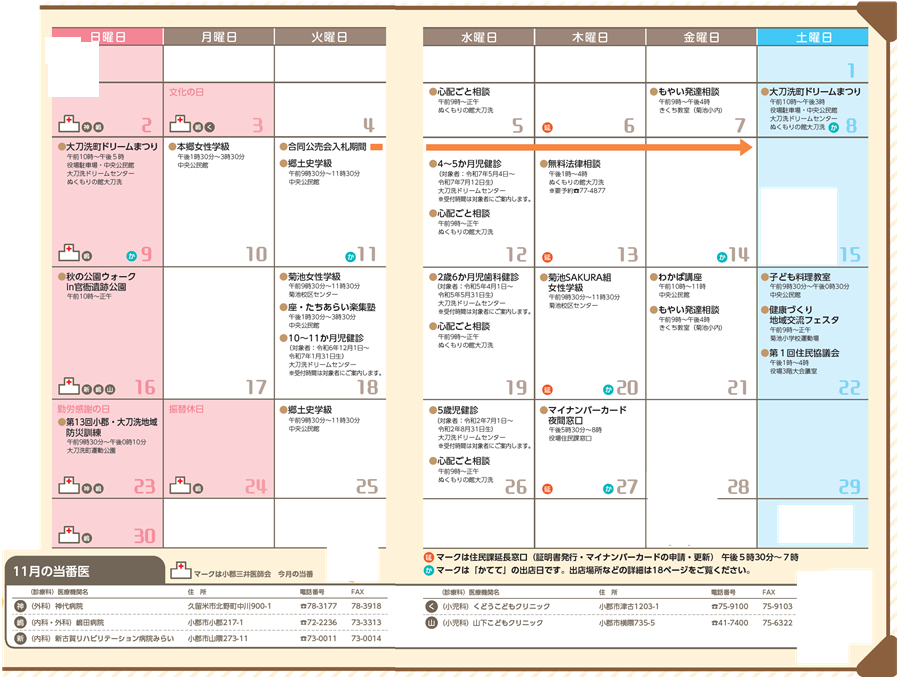 イベント 11月行事予定 November 13/26 前の記事 次の記事 発行日 : 2025年11月01日 自治体名 : 福岡県大刀洗町 広報紙名 : 広報たちあらい 令和7年11月号 Tweet シェアする 【こんにちは保健師です】たちあらい健康ラボ通信 かててTACHIARAI MARCHE 11月