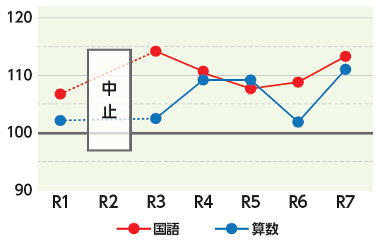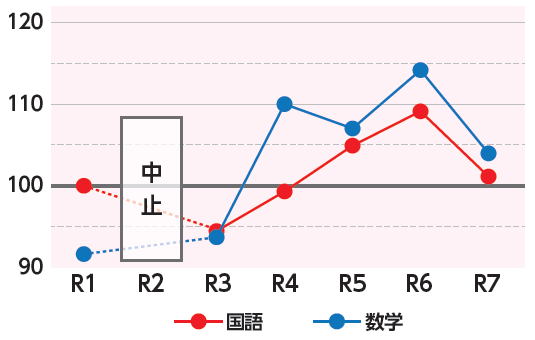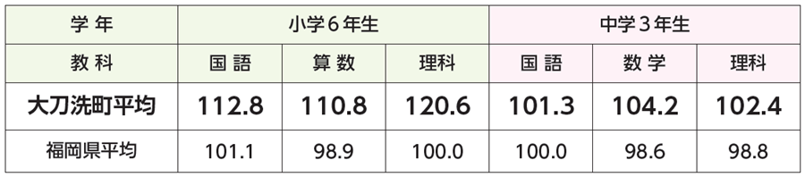 小・中学校の国語、算数・数学、理科とも、全国平均(100.0)/福岡県平均を上回っており、堅調に維持できている。