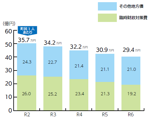 令和6年度末の地方債残高は40億2113万円で、前年比5・2%の減少。新規発行額よりも償還額が大きいため、残高は減少傾向にあります。しかし、今後は老朽化した施設の更新のため、基金の取り崩し額や地方債の新規発行額の増加が見込まれます。