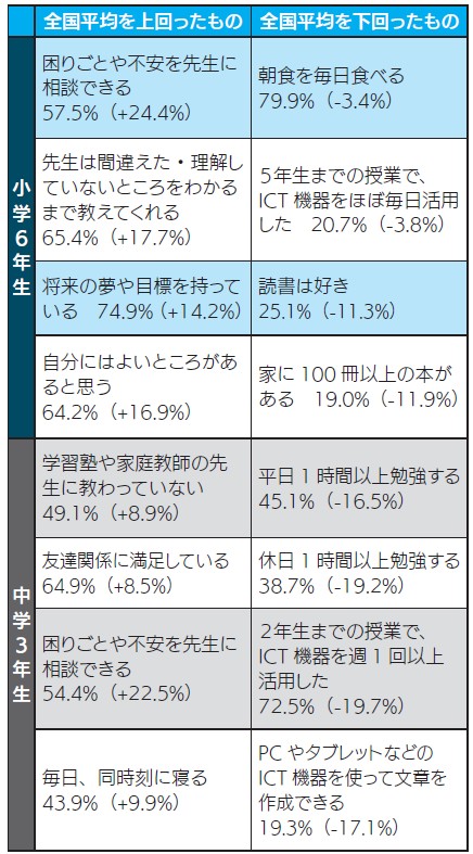各項目で高い割合を示している児童生徒ほど、学力も高いという結果が報告されています。