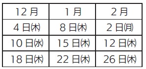 日時:(月)(水)(金)、10:00~16:00(年末年始、祝日を除く)