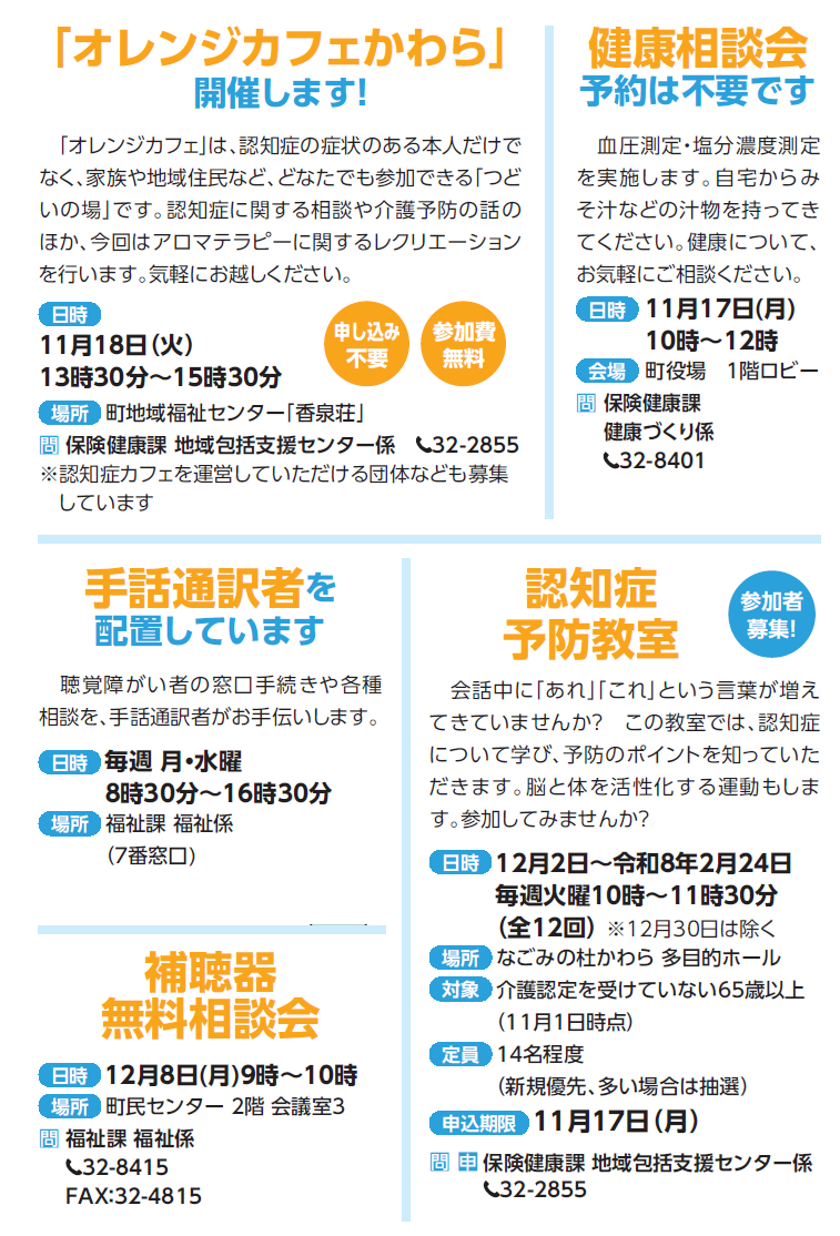 健康 健康・シニア(1) 3/21 前の記事 次の記事 発行日 : 2025年11月07日 自治体名 : 福岡県香春町 広報紙名 : 広報かわら 令和7年11月号 Tweet シェアする 11月は「高齢者虐待防止推進月間」 令和7年度ゲートキーパー養成研修会