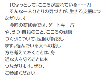 講座 令和7年度ゲートキーパー養成研修会 4/21 前の記事 次の記事 発行日 : 2025年11月07日 自治体名 : 福岡県香春町 広報紙名 : 広報かわら 令和7年11月号 ■みんなでできる自殺対策 こころの不調のサインについて学ぶ 先着:80名 令和7年 12/18(木) ■「ゲートキーパー」とは Tweet シェアする 健康・シニア(1) 健康・シニア(2)