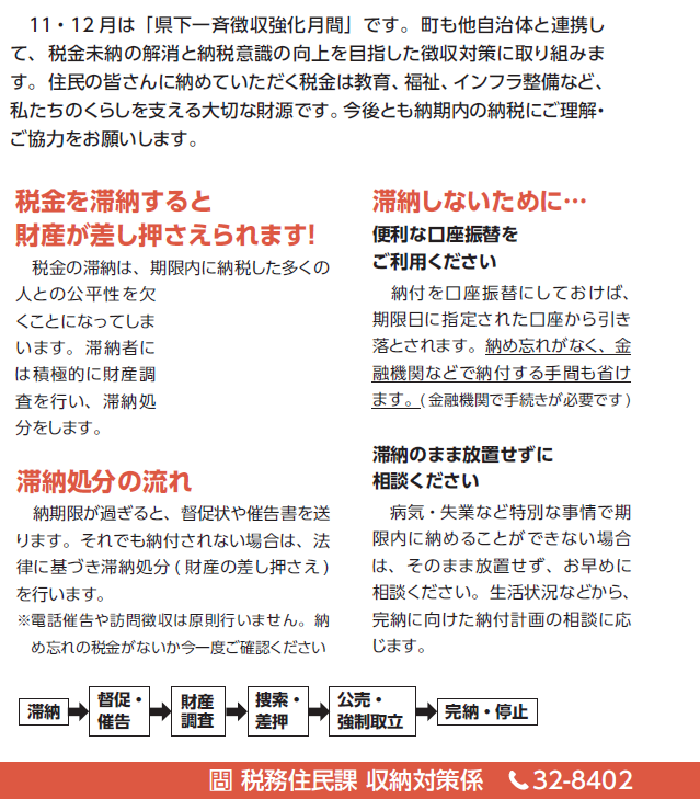 くらし 11~12月は「県下一斉徴収強化月間」です 税金の納め忘れはありませんか? 18/21 前の記事 次の記事 発行日 : 2025年11月07日 自治体名 : 福岡県香春町 広報紙名 : 広報かわら 令和7年11月号 Tweet シェアする 人の動き 税の伝言板