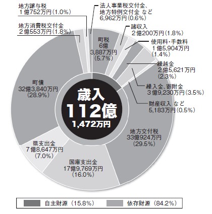 歳入は小中学校建設事業や公共土木災害復旧事業などに係る国庫支出金および町債が増額となったため、前年度に比べ、11億5432万円の増額となりました。しかし、自主財源である町税は、前年度に比べ3275万円の減収となりました。この要因は、個人町民税の納税義務者の減少や所得税および個人町民税の定額減税が影響しています。なお、定額減税の実施に伴う個人町民税の減収分は、地方特例交付金により、全額補填されています。