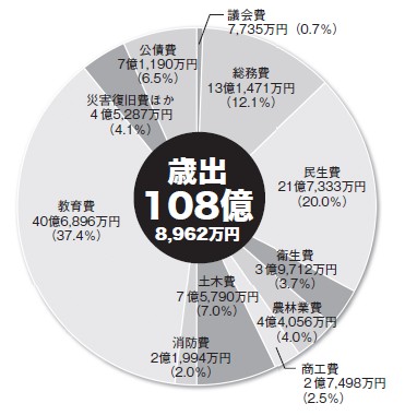 歳出は、前年度に比べ、11億8453万円の増額となりました。増加の主な要因は、ひこさんホテル和の営業再開に向けた空調設備などの改修工事や小中学校建設事業における校舎新築工事の事業費の増加によるものです。