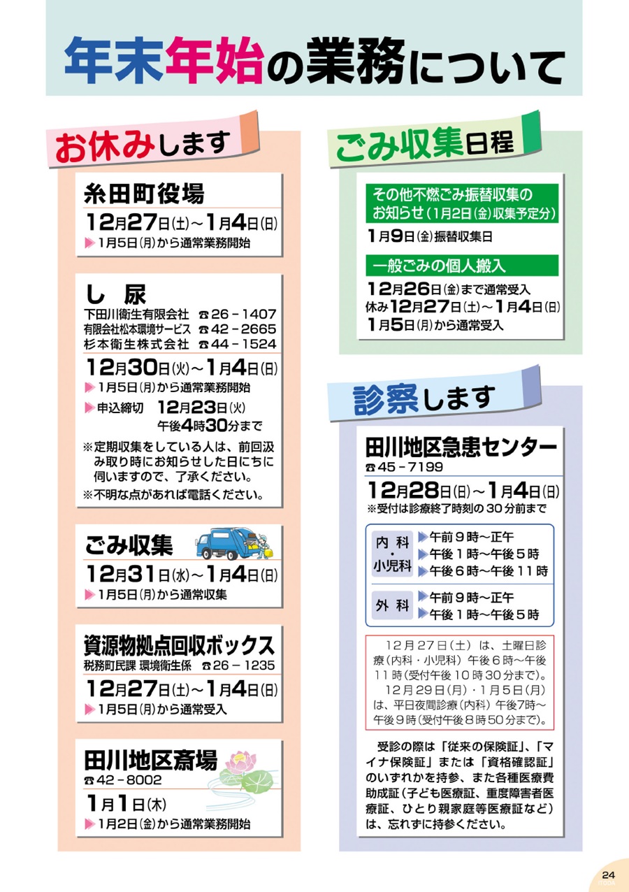 くらし 広報いとだ 令和7年12月号 P.24 23/23 前の記事 発行日 : 2025年12月01日 自治体名 : 福岡県糸田町 広報紙名 : 広報いとだ 令和7年12月号 Tweet シェアする 広報いとだ 令和7年12月号 P.23