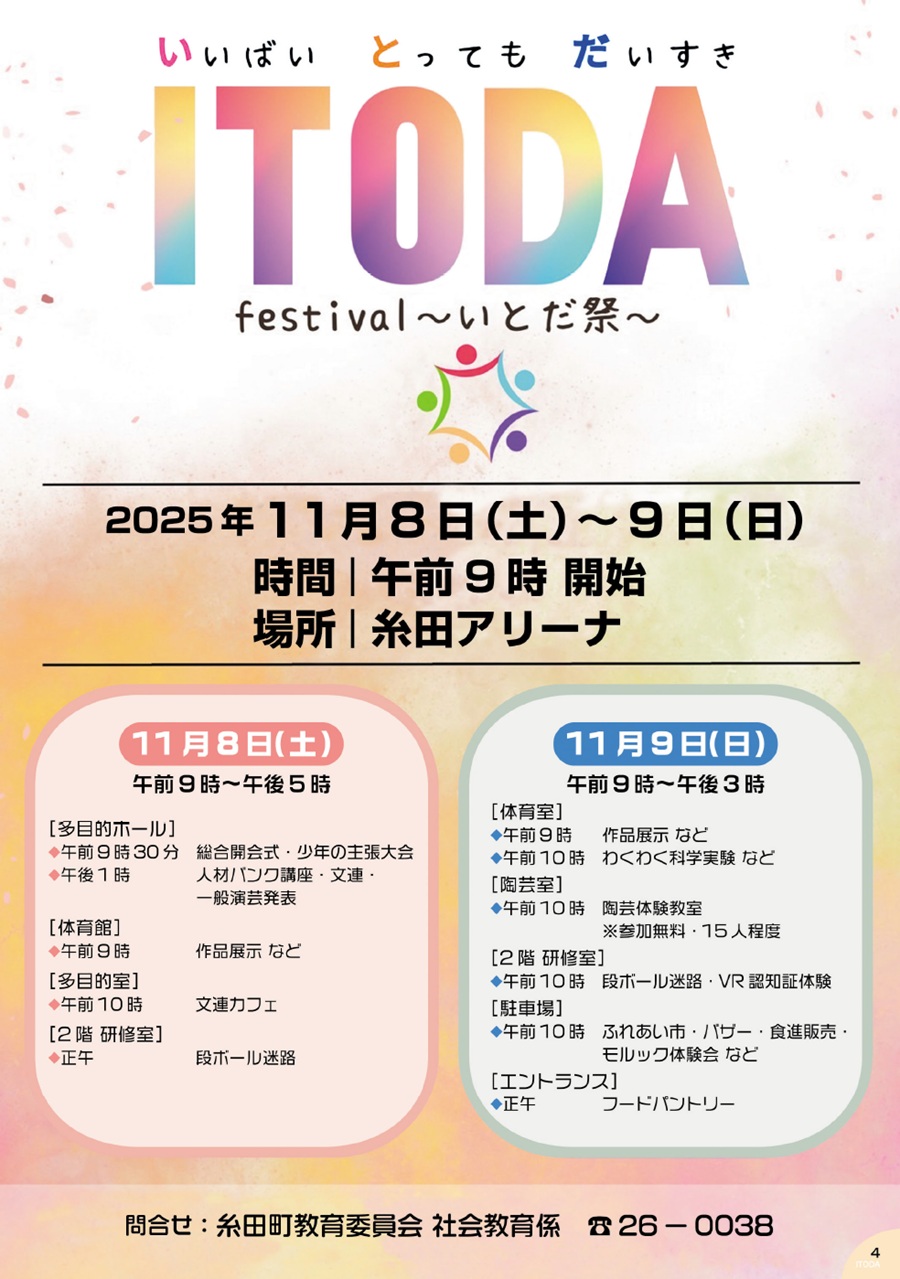 イベント 広報いとだ 令和7年10月号 P.4 4/20 前の記事 次の記事 発行日 : 2025年10月01日 自治体名 : 福岡県糸田町 広報紙名 : 広報いとだ 令和7年10月号 Tweet シェアする 広報いとだ 令和7年10月号 P.3 広報いとだ 令和7年10月号 P.5