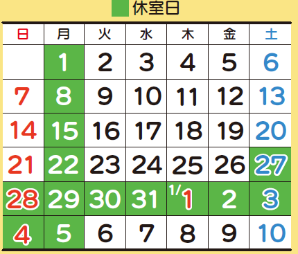 今月の休室日:月曜日・年末年始(12月27日(土)~(令和8年1月5日(月))