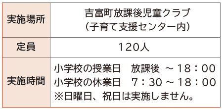 子育て 4月からの放課後児童クラブ受付を開始します! 27/63 前の記事 次の記事 発行日 : 2025年12月01日 自治体名 : 福岡県吉富町 広報紙名 : 広報よしとみ 令和7年12月号 対象期間:令和8年4月から1年間 申込期限:12月1日(月)~22日(月)まで 受付場所:子育て健康課 対象児童:仕事などで保護者が昼間家庭にいない小学校1年生~6年生までの児童 放課後児童クラブは、日中に保護者のいない児童が安全・安心に過ごせる居場所であり、「遊び」や「生活」をとおして、こどもたちの健全な育成に努めています。 ※現在利用中の方も、新たに申込みが必要です。(自動継続ではありません。) 問合せ:子育て健康課 【電話】24・1133 Tweet シェアする 下水道を使ってきれいな海を守りましょう! ひきこもり相談会を行います