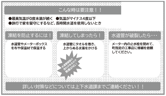 くらし 寒波に備えて、凍結対策を!! 26/52 前の記事 次の記事 発行日 : 2026年01月01日 自治体名 : 福岡県吉富町 広報紙名 : 広報よしとみ 令和8年1月号 寒い日が続いております。 寒波に備えて水道管の凍結対策をしましょう! 問合せ:上下水道課 【電話】24・4074 Tweet シェアする 道路等の維持管理作業員を募集します! 今月の健康案内
