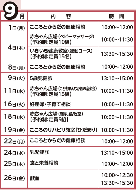 健康 今月の健康案内 21/63 前の記事 次の記事 発行日 : 2025年09月01日 自治体名 : 福岡県吉富町 広報紙名 : 広報よしとみ 令和7年9月号 場所:あいあいセンター 【予約制】は、各開催の1週間前までにあいあいセンターにお申込みください。 問合せ:あいあいセンター 【電話】23・9900 Tweet シェアする 一時預かり保育をご存じですか? こころとからだの健康相談を利用してみませんか?