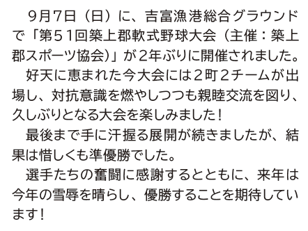 スポーツ 築上郡軟式野球大会開催!町の誇りを胸に全力プレー! 50/53 前の記事 次の記事 発行日 : 2025年10月01日 自治体名 : 福岡県吉富町 広報紙名 : 広報よしとみ 令和7年10月号 Tweet シェアする 政治倫理審査会意見書が提出されました 子育てに優しいまちづくりを進めています