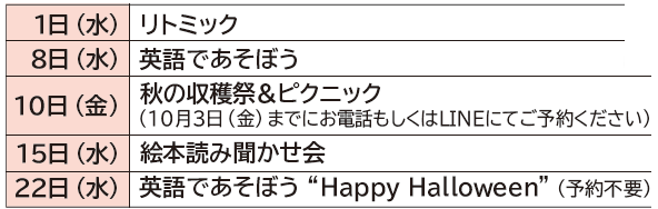 10月は「秋の収穫祭andピクニック」のほか、英語で遊ぼうでは、「ハロウィン撮影会」を行います!