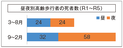 秋から冬にかけては、夕暮れから夜間に高齢歩行者の交通死亡事故が増加傾向にあります。