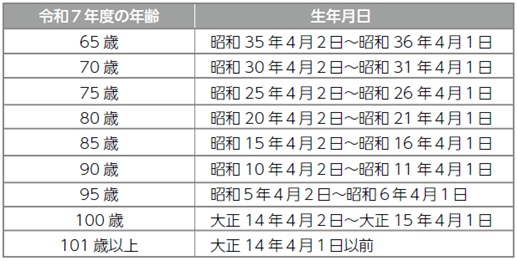 ・65歳以上で、下記の表に該当する年齢の方
