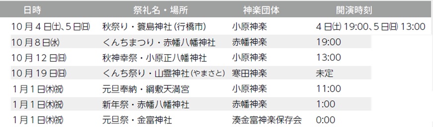築上町には7つの神楽団体が現存し、神と人をつなぐお囃子や舞が地域の人々によって引き継がれ、守られています。
