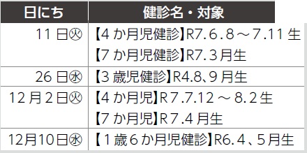 ◇11月の乳幼児健診 予定表(11/1-12/10)