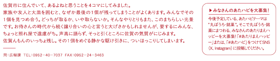 くらし 佐賀市の#あたりまえハッピー #18 12/27 前の記事 次の記事 発行日 : 2025年12月15日 自治体名 : 佐賀県佐賀市 広報紙名 : 市報さが 令和7年12月15日号 ※「あたハピ4コマ劇場」詳細は本紙をご覧ください。 Tweet シェアする 佐賀市の#あたりまえハッピー #17 子育て支援センターNAVI 令和8年1月の予定『 ゆめ・ぽけっと』