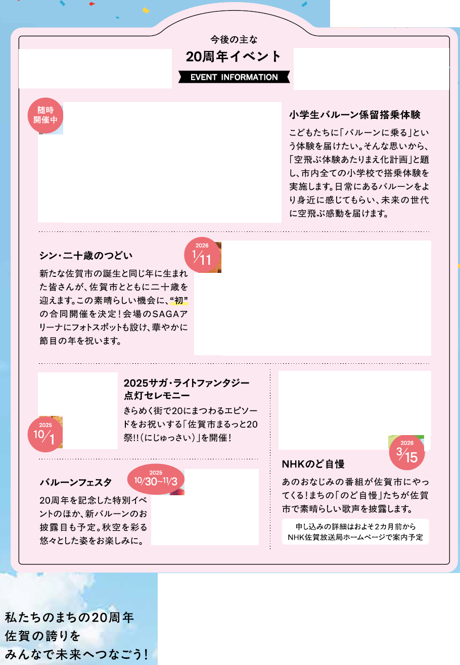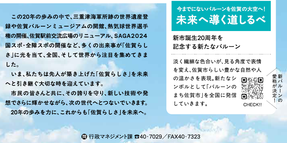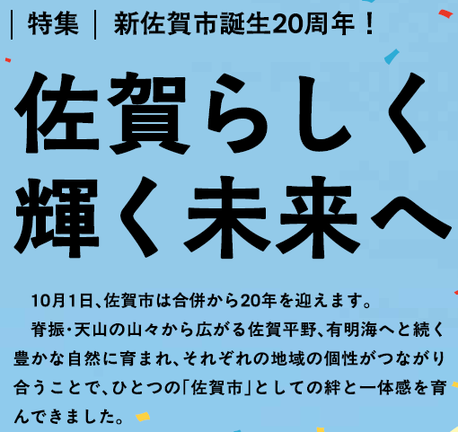 イベント 【特集】新佐賀市誕生20周年! 佐賀らしく輝く未来へ 4/28 前の記事 次の記事 発行日 : 2025年10月01日 自治体名 : 佐賀県佐賀市 広報紙名 : 市報さが 令和7年10月1日号 Tweet シェアする 動きます、佐賀市。 市長会見やメディアを通して発信した情報の一部を紹介! 編集部のイチオシ! 今月のピックアップ!(1)