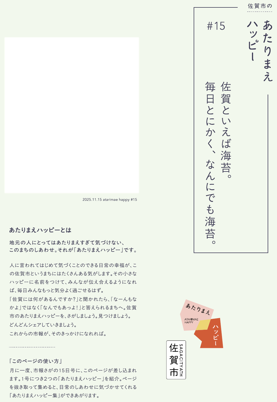 くらし 佐賀市の#あたりまえハッピー #15 11/27 前の記事 次の記事 発行日 : 2025年11月15日 自治体名 : 佐賀県佐賀市 広報紙名 : 市報さが 令和7年11月15日号 Tweet シェアする 図書館だより 佐賀市の#あたりまえハッピー #16