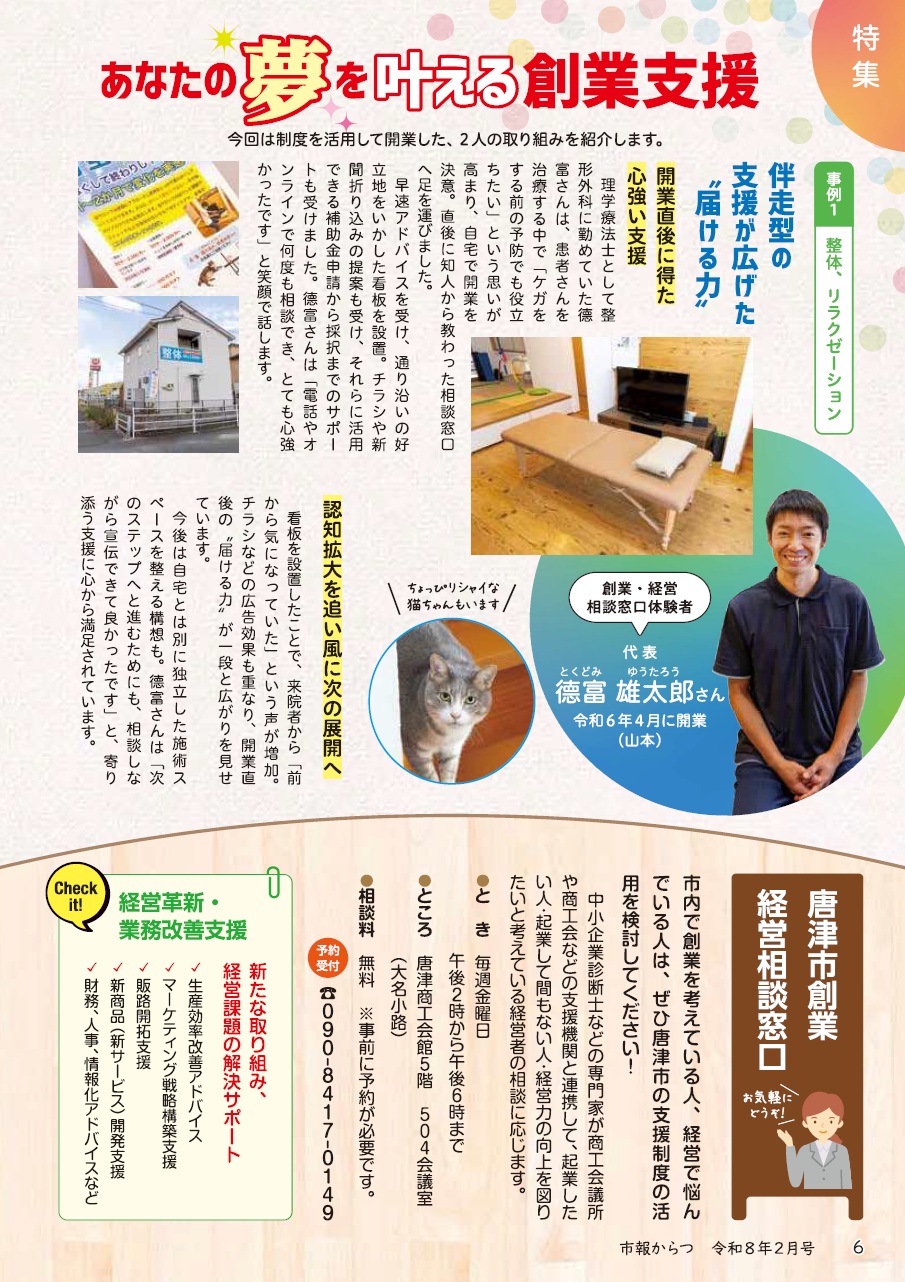 しごと 市報からつ 令和8年2月号(Vol.253)P.6 5/23 前の記事 次の記事 発行日 : 2026年02月01日 自治体名 : 佐賀県唐津市 広報紙名 : 市報からつ 令和8年2月号(Vol.253) Tweet シェアする 市報からつ 令和8年2月号(Vol.253)P.4・5 市報からつ 令和8年2月号(Vol.253)P.7