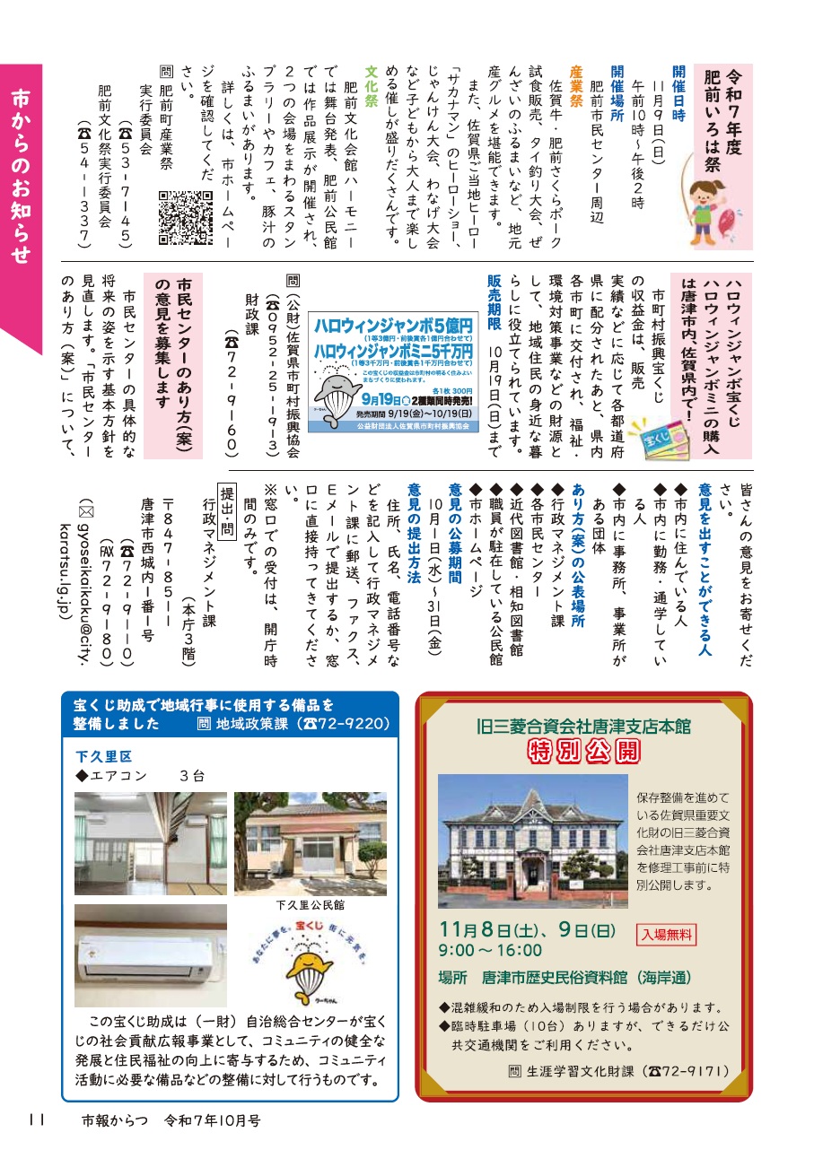 くらし 市報からつ 令和7年10月号(Vol.249)P.11 10/23 前の記事 次の記事 発行日 : 2025年10月01日 自治体名 : 佐賀県唐津市 広報紙名 : 市報からつ 令和7年10月号(Vol.249) Tweet シェアする 市報からつ 令和7年10月号(Vol.249)P.10 市報からつ 令和7年10月号(Vol.249)P.12