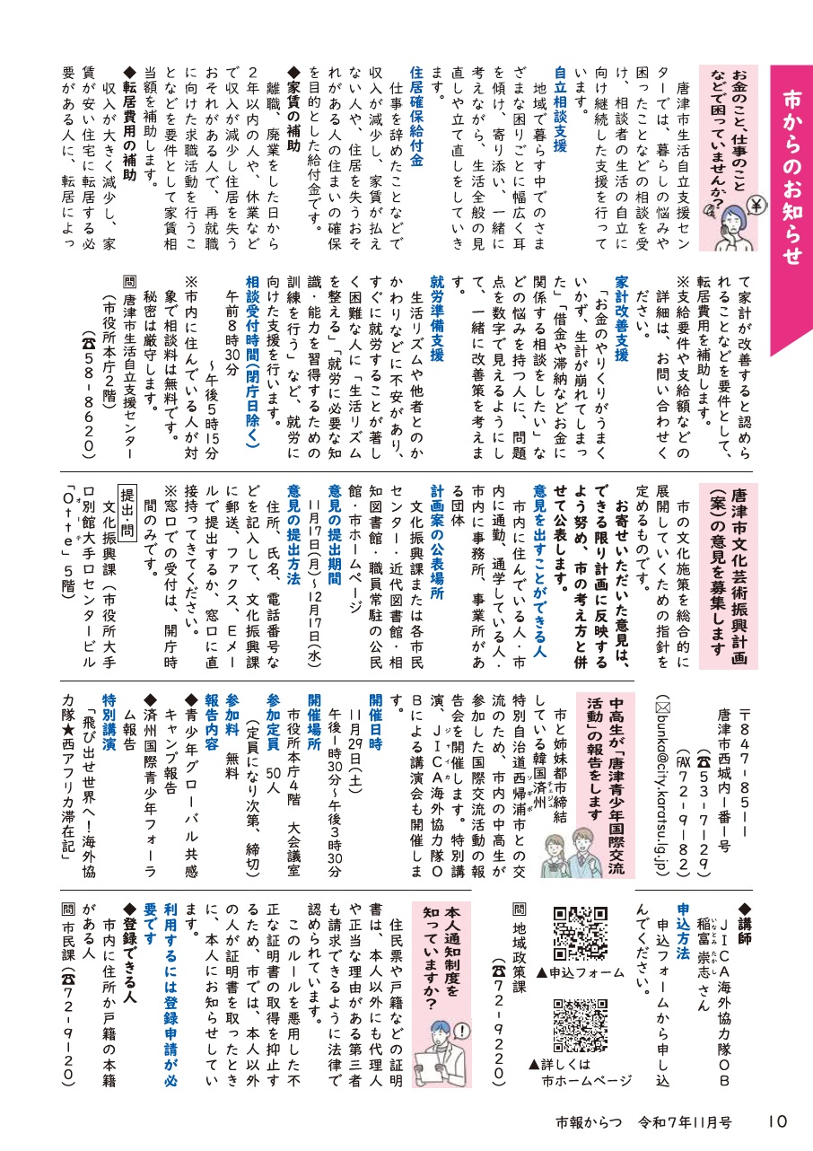 くらし 市報からつ 令和7年11月号(Vol.250)P.10 10/24 前の記事 次の記事 発行日 : 2025年11月01日 自治体名 : 佐賀県唐津市 広報紙名 : 市報からつ 令和7年11月号(Vol.250) Tweet シェアする 市報からつ 令和7年11月号(Vol.250)P.9 市報からつ 令和7年11月号(Vol.250)P.11