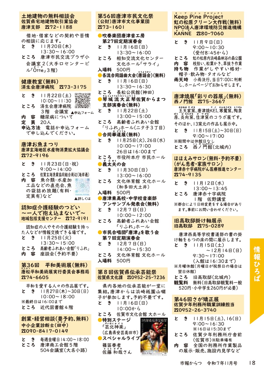 イベント 市報からつ 令和7年11月号(Vol.250)P.18 18/24 前の記事 次の記事 発行日 : 2025年11月01日 自治体名 : 佐賀県唐津市 広報紙名 : 市報からつ 令和7年11月号(Vol.250) Tweet シェアする 市報からつ 令和7年11月号(Vol.250)P.17 市報からつ 令和7年11月号(Vol.250)P.19