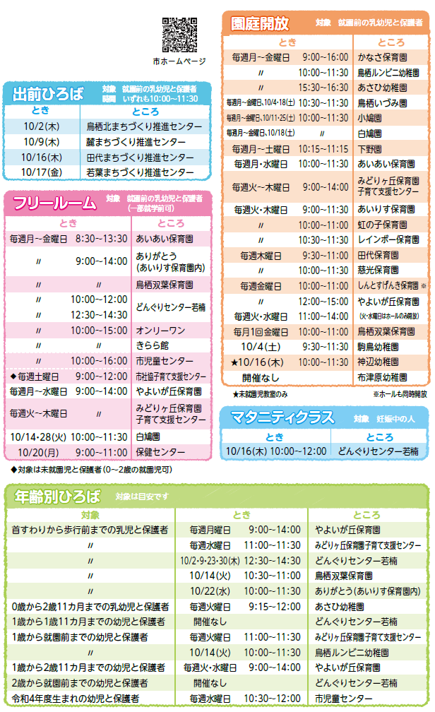 各行事はいずれも参加自由(祝日は開催なし)。詳しくは子育て支援総合コーディネーター(【電話】0942-85-3552)へ。