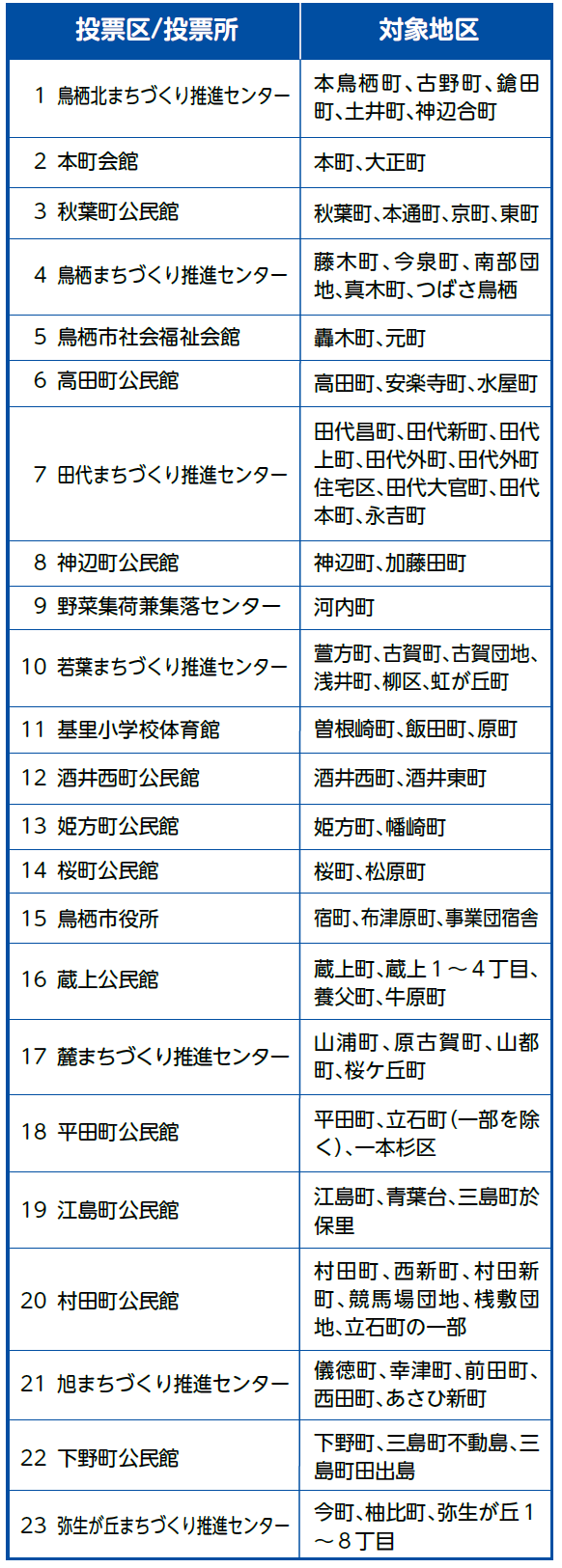 投票所は右ページの一覧のとおりです。自分の投票所を確かめてお越しください。なお、開票は同日21時から市民体育館で行います。また、開票速報を市ホームページに掲載します。