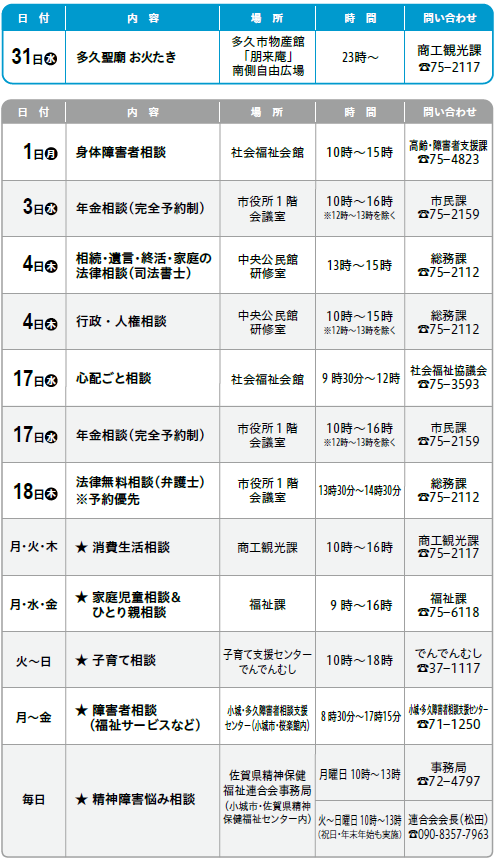 くらし 催しand相談スケジュール 12月 27/32 前の記事 次の記事 発行日 : 2025年12月01日 自治体名 : 佐賀県多久市 広報紙名 : 市報たく 令和7年12月号 ■催しand相談 市外局番(0952) ※祝日は休みです ※★印は電話での相談も受け付けます Tweet シェアする 多久に密着!暮らしに役立つ情報をお届け。多久ケーブルメディア番組ガイド 12月 人のうごき