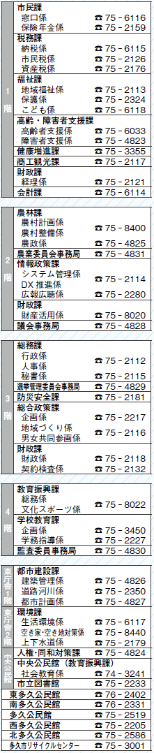 その他 直通電話のご案内 29/32 前の記事 次の記事 発行日 : 2025年12月01日 自治体名 : 佐賀県多久市 広報紙名 : 市報たく 令和7年12月号 各課への問い合わせは、直通電話をご利用ください。 市外局番(0952) Tweet シェアする 人のうごき 多久聖廟年末年始イルミネーション