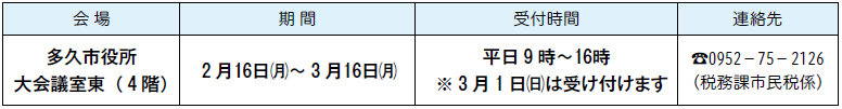 市役所では、主に農業申告や簡易な内容の申告相談を受け付けています。住宅ローン控除(初年度)、青色申告、複雑な土地・建物、株の売却などの申告相談は、佐賀税務署が開設する確定申告会場(メートプラザ佐賀)で行ってください。