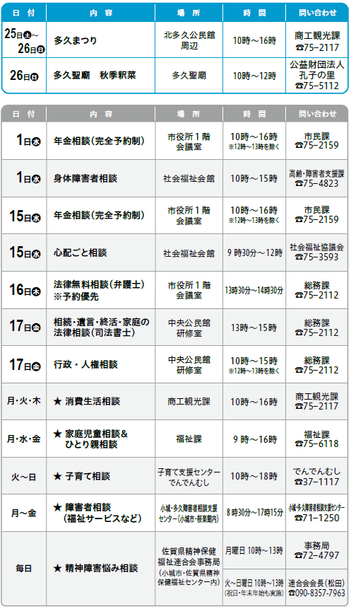 くらし 催しand相談スケジュール 10月 32/37 前の記事 次の記事 発行日 : 2025年10月01日 自治体名 : 佐賀県多久市 広報紙名 : 市報たく 令和7年10月号 ■催しand相談 市外局番(0952) ※祝日は休みです ※★印は電話での相談も受け付けます Tweet シェアする 多久に密着!暮らしに役立つ情報をお届け。多久ケーブルメディア番組ガイド 10月 人のうごき
