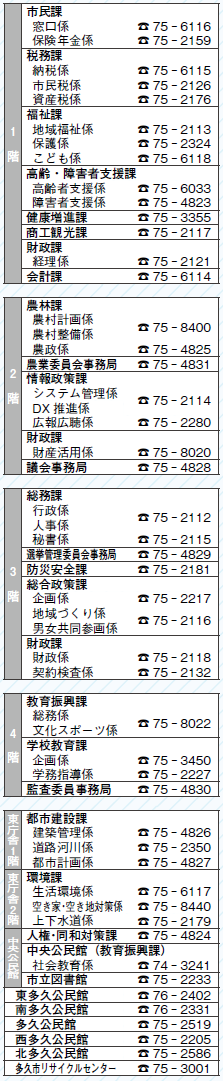 その他 直通電話のご案内 34/38 前の記事 次の記事 発行日 : 2025年11月01日 自治体名 : 佐賀県多久市 広報紙名 : 市報たく 令和7年11月号 各課への問い合わせは、直通電話をご利用ください。 市外局番(0952) Tweet シェアする 人のうごき 目指せ100か所! まちなかアートを探してみよう!!