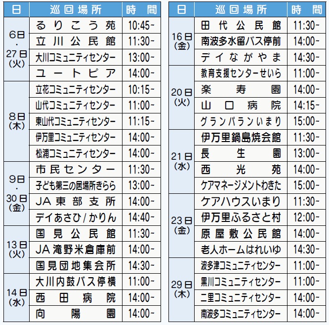 このほか、保育園や小学校、企業を巡回しています。各巡回場所での滞在時間は、15〜30分です。予約本の受け取りもできます。