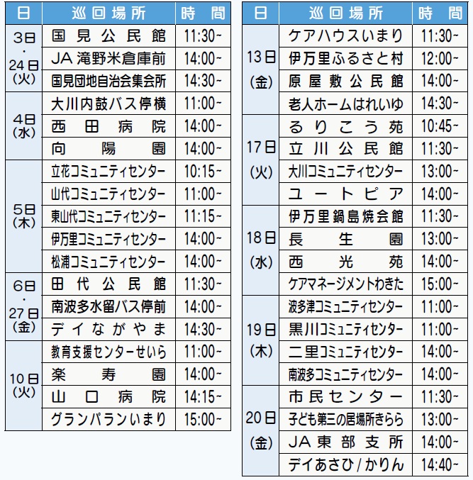 このほか、保育園や小学校、企業を巡回しています。各巡回場所での滞在時間は、15〜30分です。予約本の受け取りもできます。