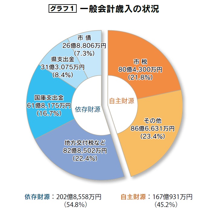 歳入は、市税など市が独自に確保できる『自主財源』と、国や県から交付される補助金、交付金などの『依存財源』に分けられます。