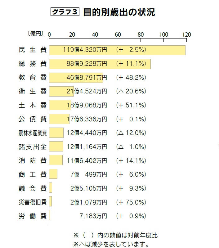 このほか、学校教育や社会教育などの『教育費』に約47億円、生活環境整備などの『衛生費』に約21億円、道路や河川、公園整備などの『土木費』に約19億円、借入金の元利償還金に充てる『公債費』に約18億円を支出しました。