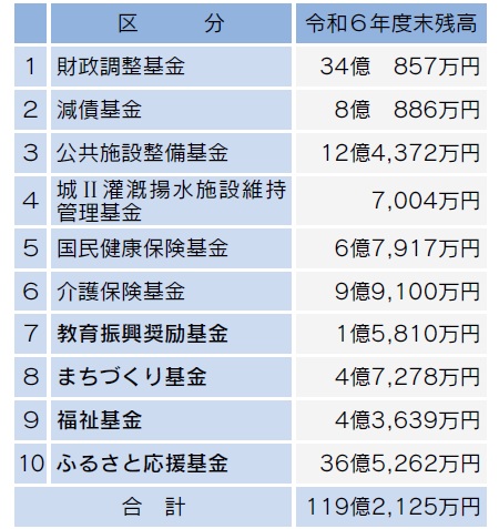 『基金』は、一般家庭の普通預金に当たる財政調整基金や借金の返済に充てる減債基金など、10の基金があります。