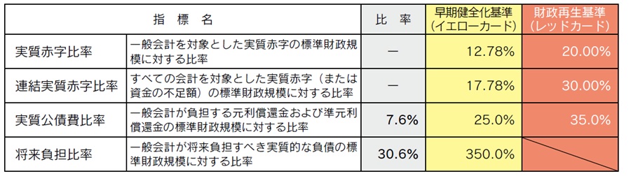 この指標は、値が小さいほど財政が健全であることを示します。令和6年度決算に基づき算定した各指標は、いずれも早期健全化の基準値を下回りました。