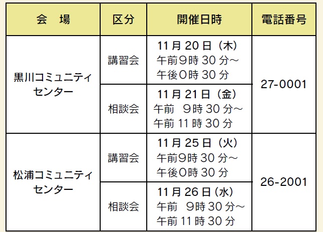 次の表のとおり各コミュニティセンターで開催しますので、気軽に参加してください。