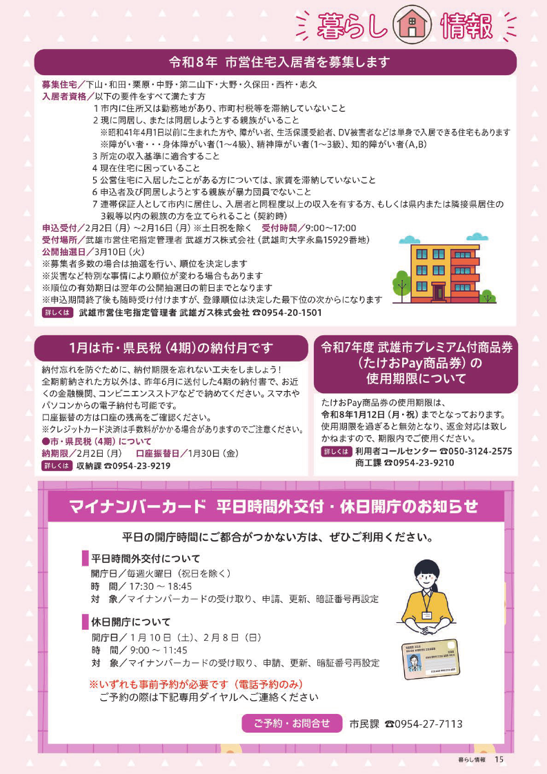 くらし 広報武雄 令和8年1月号 P.15 16/28 前の記事 次の記事 発行日 : 2026年01月01日 自治体名 : 佐賀県武雄市 広報紙名 : 広報武雄 2026年1月号 Tweet シェアする 広報武雄 令和8年1月号 P.14 広報武雄 令和8年1月号 P.16