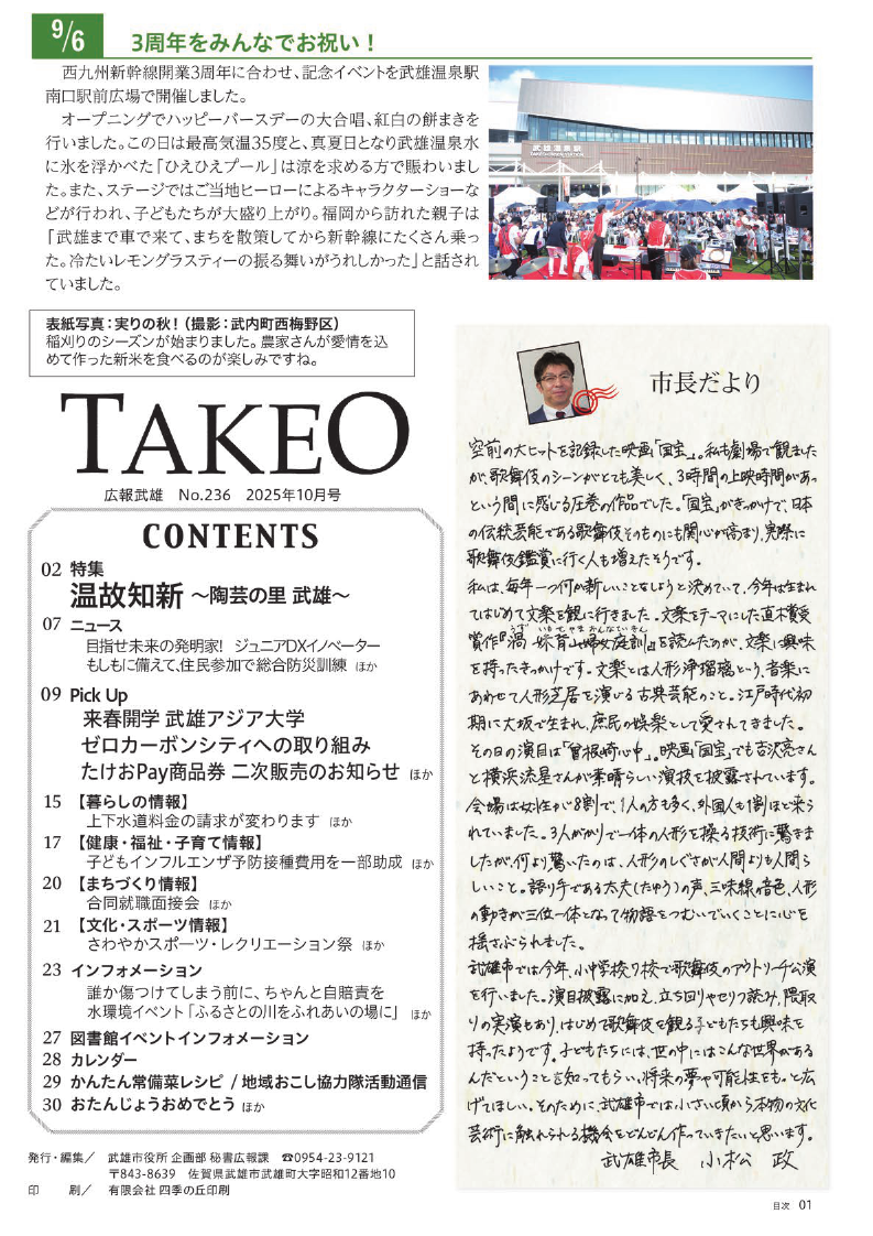 くらし 広報武雄 令和7年10月号 P.01 2/32 前の記事 次の記事 発行日 : 2025年10月01日 自治体名 : 佐賀県武雄市 広報紙名 : 広報武雄 2025年10月号 Tweet シェアする 広報武雄 令和7年10月号 表紙 広報武雄 令和7年10月号 P.02