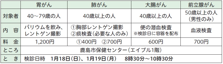 胃がん・肺がん・大腸がん・前立腺がんの最大4種類のがん検診を同日に受けることができます。1種類からでも受診できます。ネットまたは電話にて申し込みされた人には受診票を発行します。
