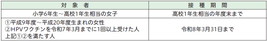 キャッチアップ世代と今年度高校1年生相当の人の接種期限は、令和8年3月31日までです。16歳以上の女子で接種を希望する人は早めに医療機関へ接種予約をしてください。