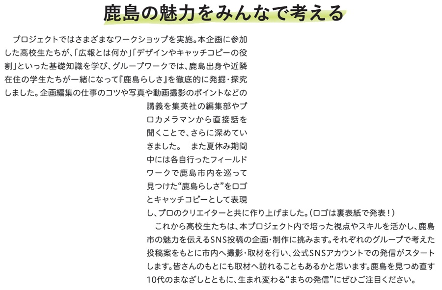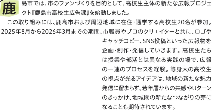 子育て [特集]鹿島の『魅力』を高校生の視点で発掘・発信する新プロジェクト! 鹿島市高校生広告課 1/31 次の記事 発行日 : 2025年12月01日 自治体名 : 佐賀県鹿島市 広報紙名 : 広報かしま 令和7年12月号 鹿島を動かす主役は、君だ。 ※詳細は本紙をご覧ください。 ※詳細は本紙をご覧ください。 Tweet シェアする [市政トピックス]鹿島市表彰式