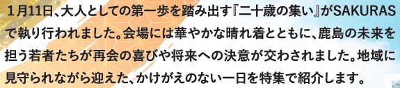 イベント [特集]未来へ一歩 令和8年 鹿島市二十歳の集い 1/31 次の記事 発行日 : 2026年02月01日 自治体名 : 佐賀県鹿島市 広報紙名 : 広報かしま 令和8年2月号 Tweet シェアする [市政トピックス]鹿島市小中学校 人権作文・標語・ポスターコンクール入賞者