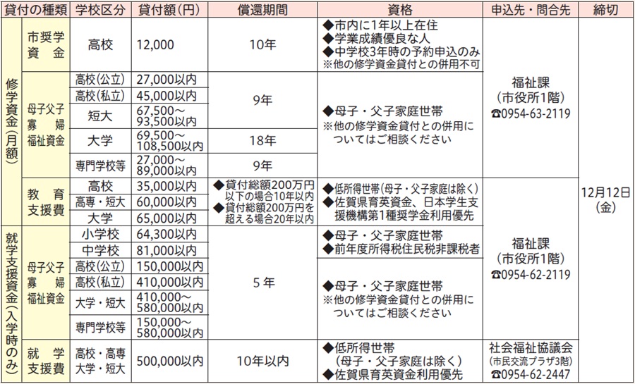 ・母子父子寡婦福祉資金の上記貸付額は、自宅通学の場合です。自宅外通学についてはお問い合わせください。